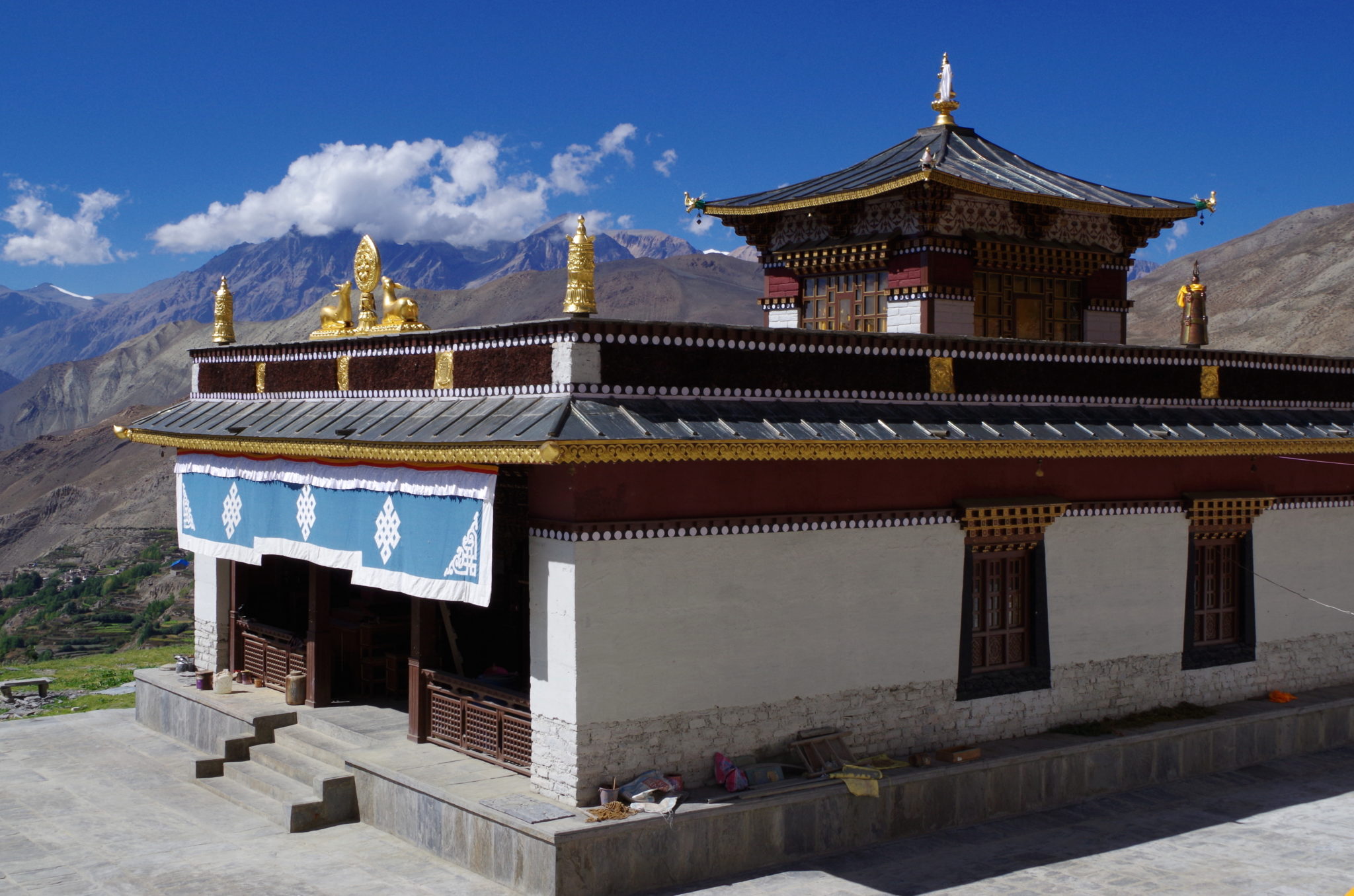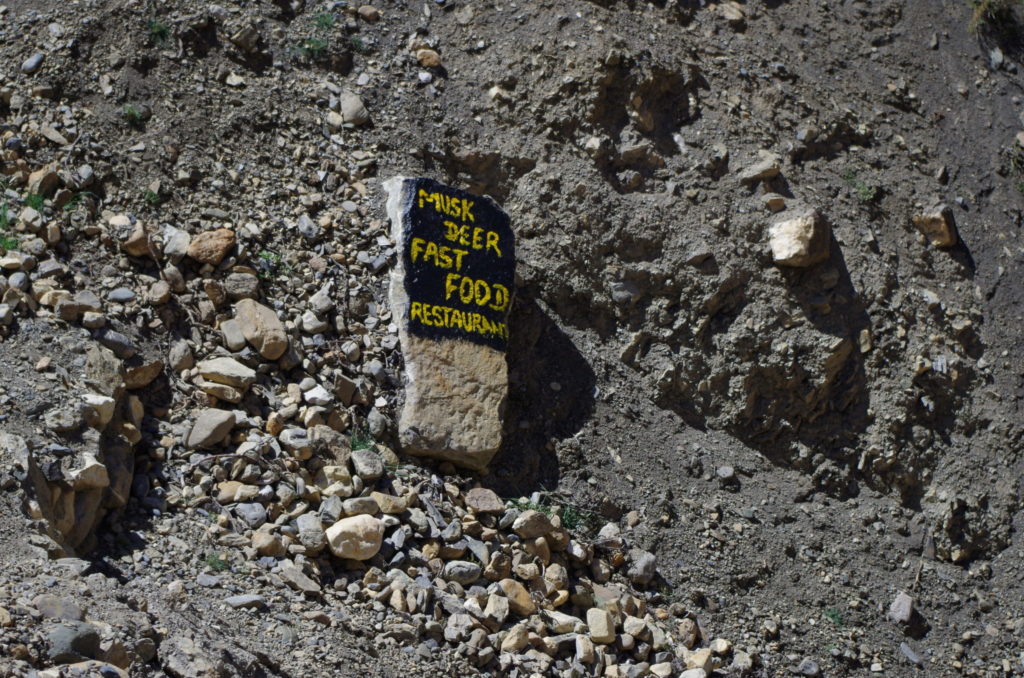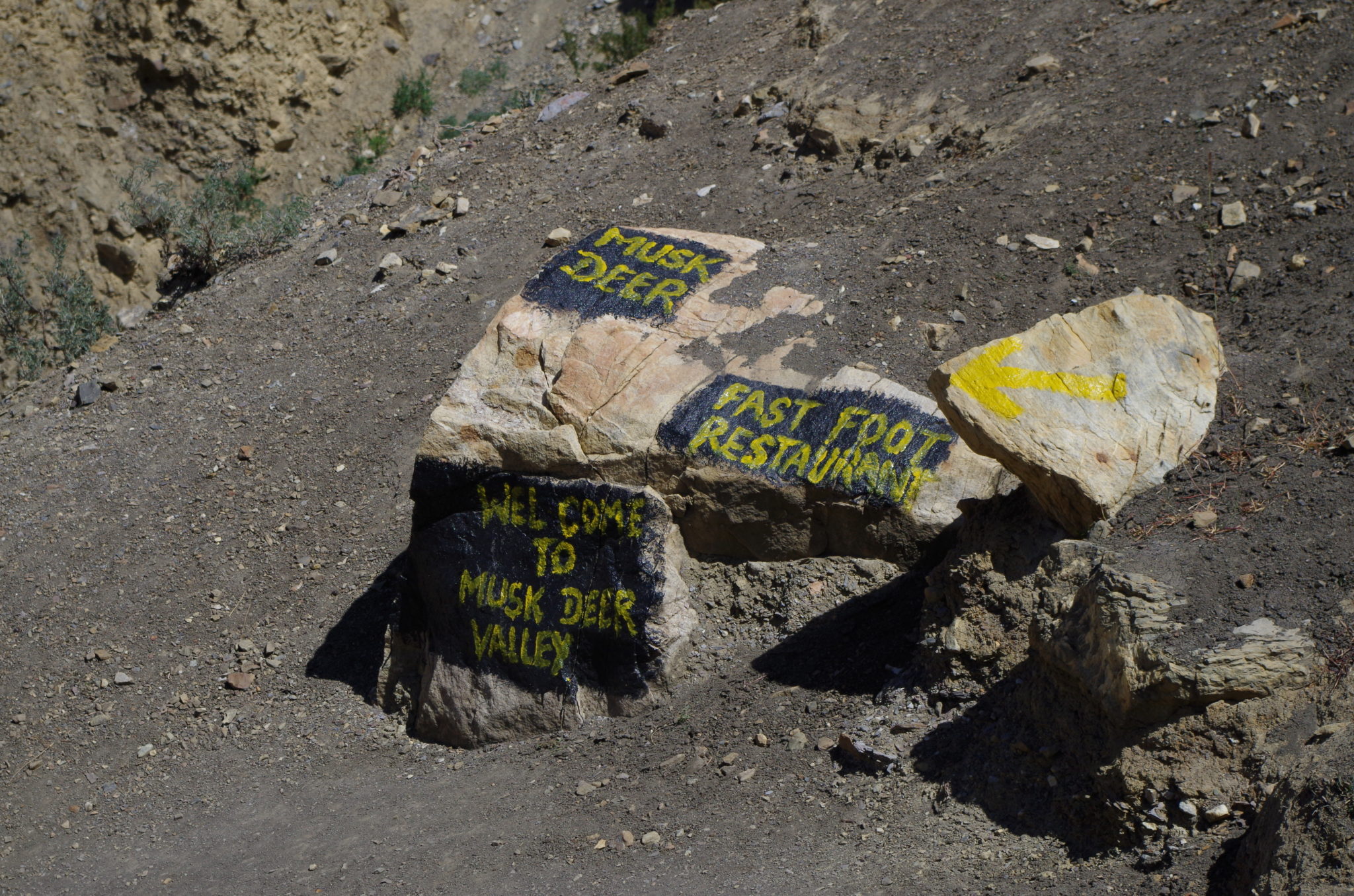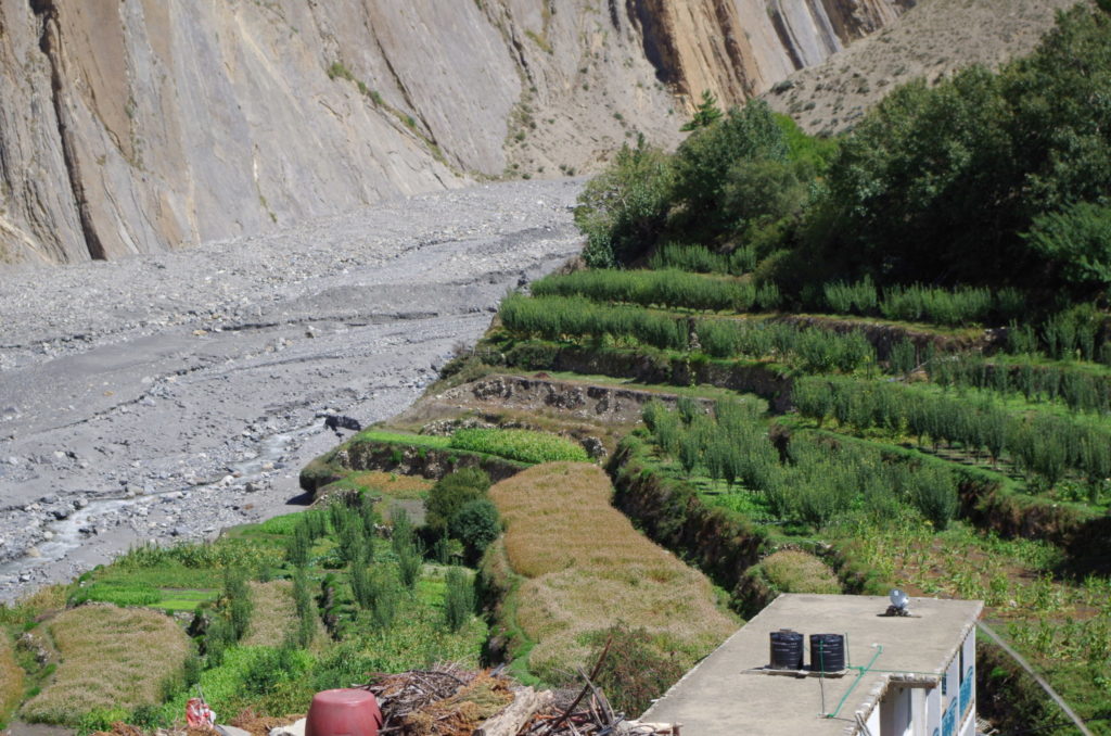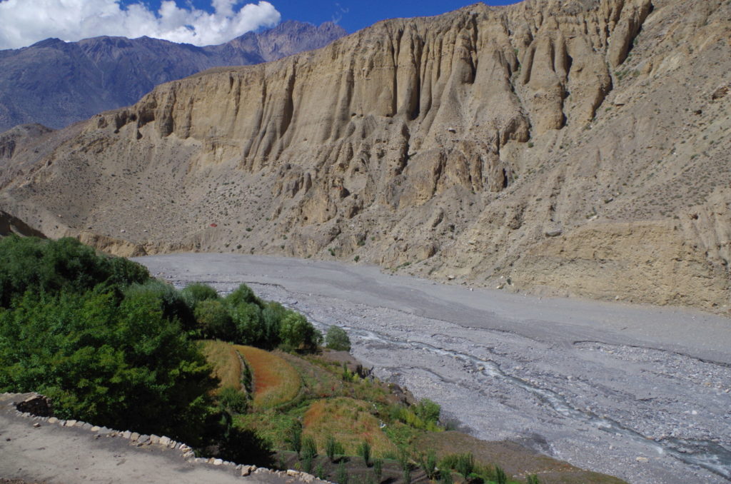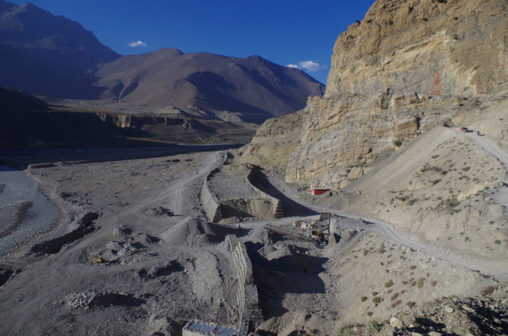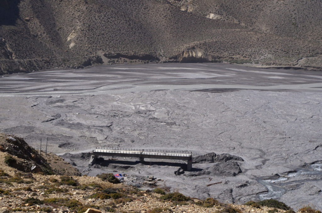 Z dołu widać było powód, dlaczego ścieżka nagle się urwała. Z powodu budowy drogi z Jomsom do Muktinath w dolinie Kali Gandaki, podcięto skarpę. Nikt nie zadał sobie jednak trudu dać na szlaku informację lub chociaż przekreślić wymalowane na kamieniach znaki, które prowadzą w pułapkę.