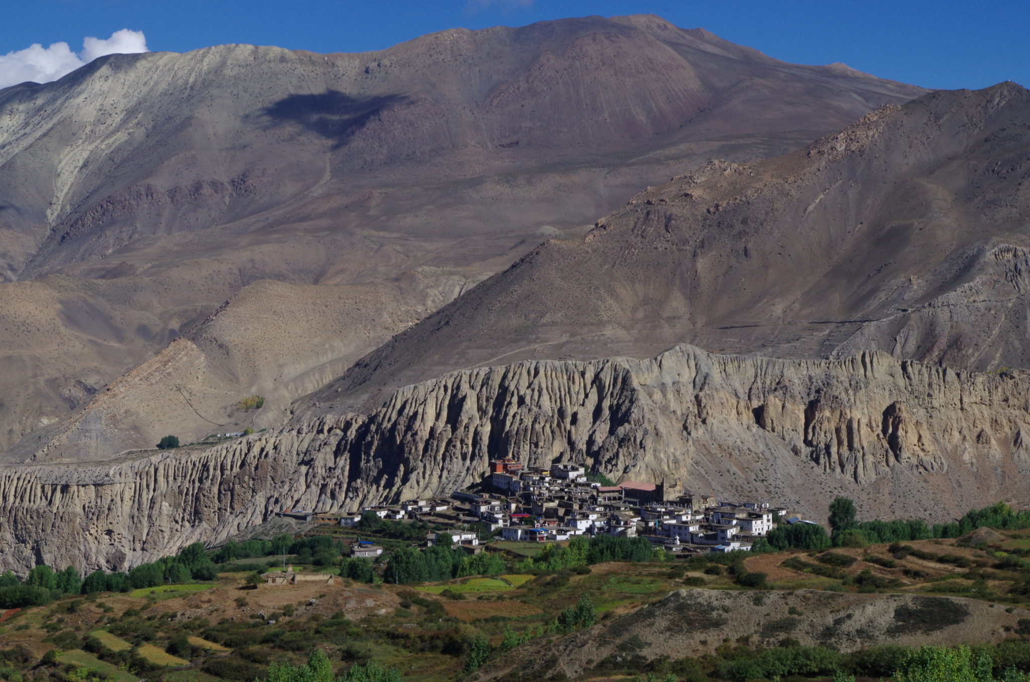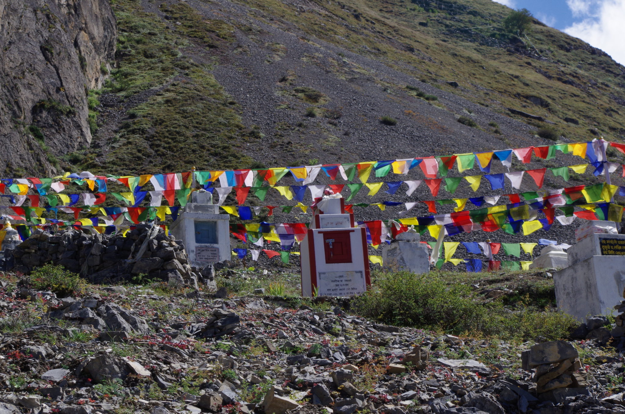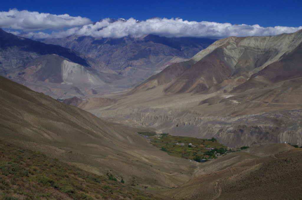 Do czasu połączenia szlaku z doliną Kali Gandaki wszystko szło zgodnie z planem. Przy zejściu natrafiliśmy jednak na niemiłą niespodziankę – szlak schodził w dół po bardzo stromym, kamienistym zboczu. Z górnej partii osuwiska widać było cały czas głazy z oznaczeniami szlaku, udało się też po części zejść, a po części w kontrolowany sposób osunąć do wypłaszczenia. Nadzieja, że dalej będzie łagodniejsze zejście do dna doliny okazała się jednak płonna. Byliśmy w pułapce – strome zbocze z osuwającymi się kamieniami powyżej i jeszcze bardziej stromy obryw skalny w dół. Do tego zwalający z nóg wiatr – charakterystyczny dla doliny w porze popołudniowej.
