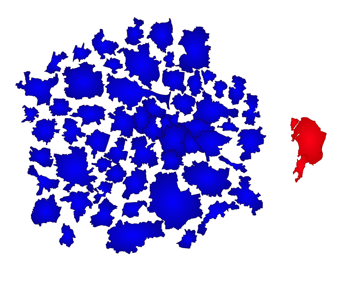 Mombaj to najludniejsze miasto prawie najludniejszego kraju świata (wg. ONZ w ciągu siedmiu lat Indie wyprzedzą pod tym względem Chiny). Powierzchniowo zbliżony do Warszawy, a zamieszkuje go 10,7 miliona osób więcej*. To tak, jak by na obszarze mniejszym od Warszawy upchnąć ludność 60 największych miast Polski – od stolicy po Pabianice, ze wszystkimi miastami pomiędzy. Inaczej mówiąc – gdyby w Warszawie mieszkała ponad 1/3 ludności Polski. Obrazowo wygląda to tak (po lewej  kontury 60 największych polskich miast, po prawej Mumbaj):