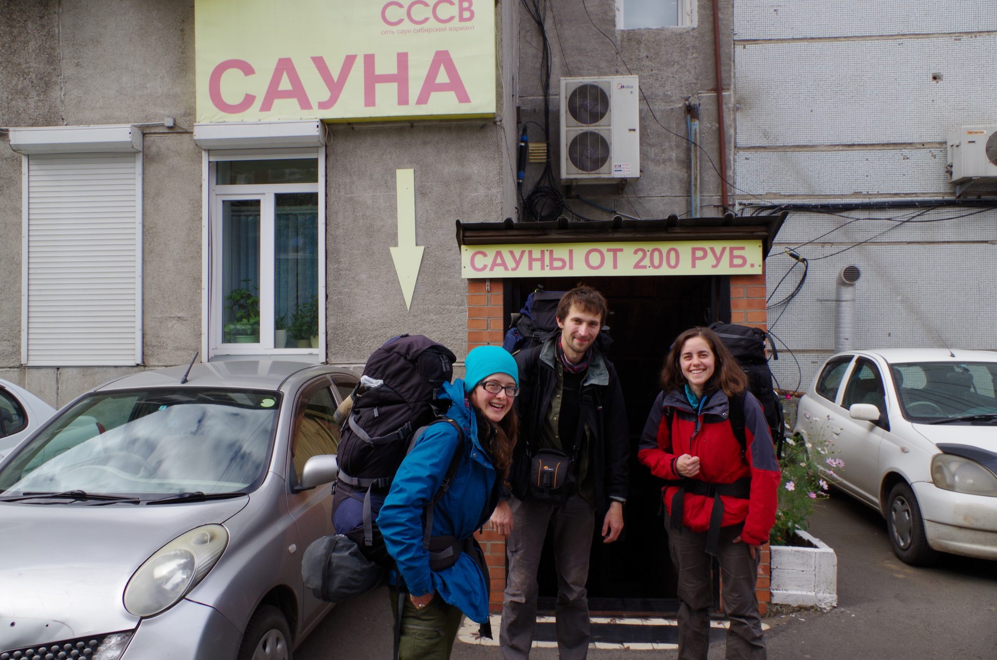 Sauny, a dokładnie banie, to nadal instytucja w Rosji popularna. W Krasnojarsku trzeba było jednak dobrze się naszukać, bo znajdowały się one głównie w podwókach. Tutaj cieszymy się po udanym saunowaniu.