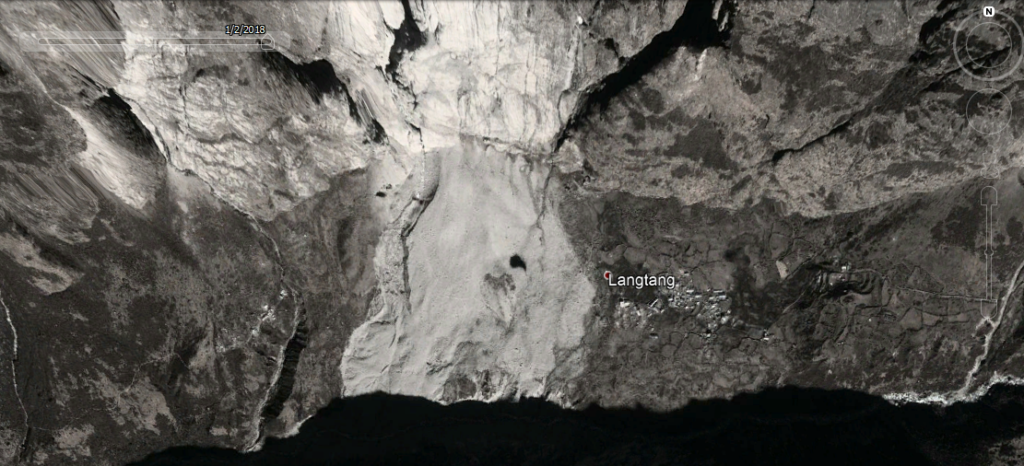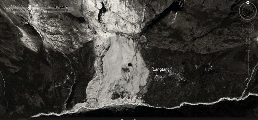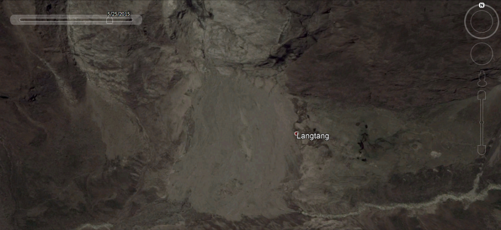 Poniżej zestawienie kilku zdjęć satelitarnych, które można obejrzeć w Google Earth. Przesuwając kolejne sceny widać Miasteczko, przykrywające je osuwisko i obszar nowego Langtangu na zachód, gdzie ludzie na nowo się osiedlają.