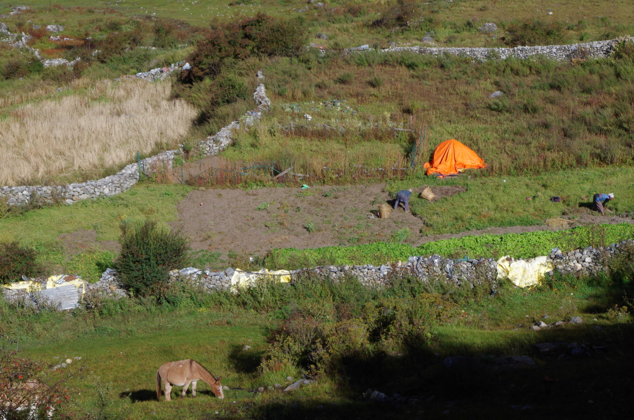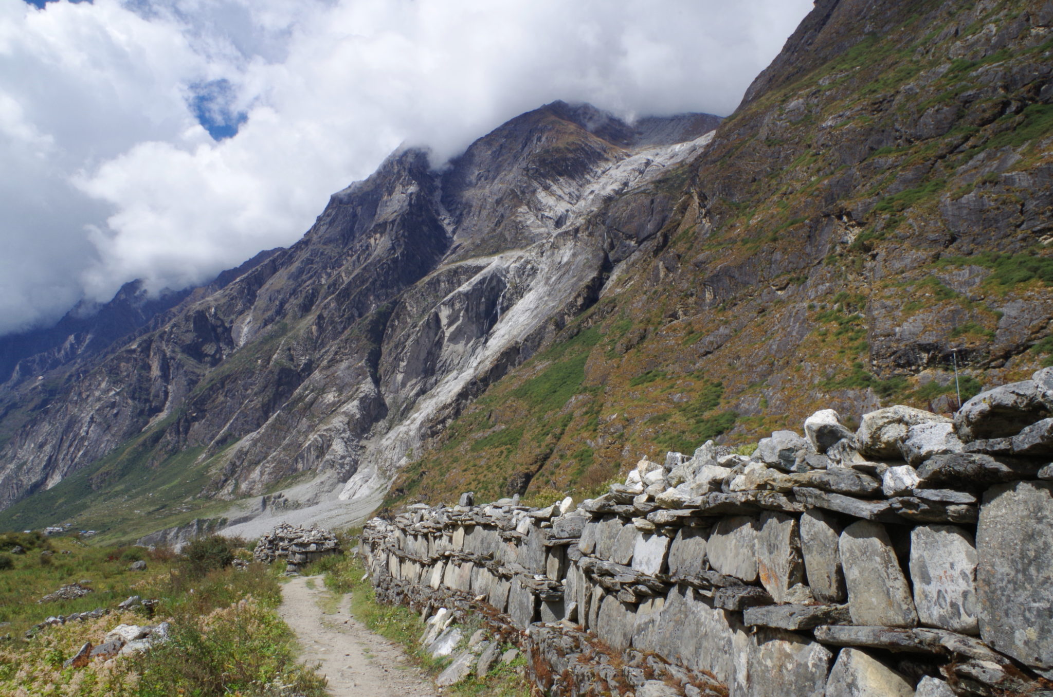 Do znacznie mniej zniszczonego Mundu przeniosło się wielu ocalałych z Langtangu. Na zdjęciu bardzo długi murek modlitewny pomiędzy tymi miejscowościami, w tle osuwisko