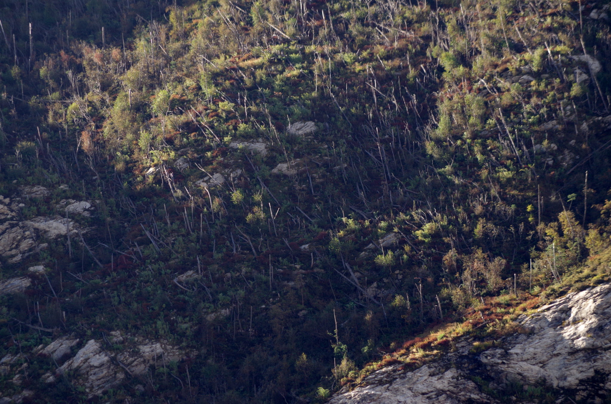 Obszar osuwiska i widoczny powyżej grzbiet ze szczytami sięgającymi powyżej 7 tysięcy metrów nad poziomem morza