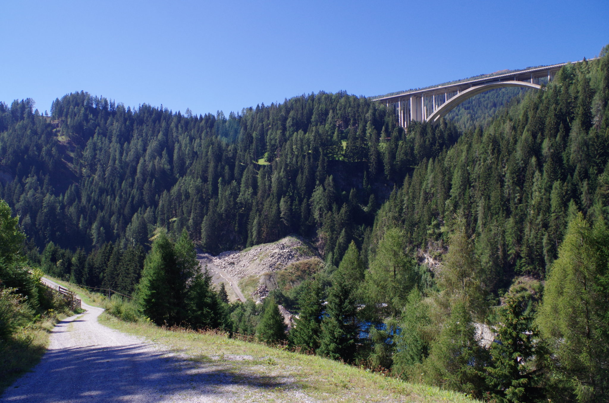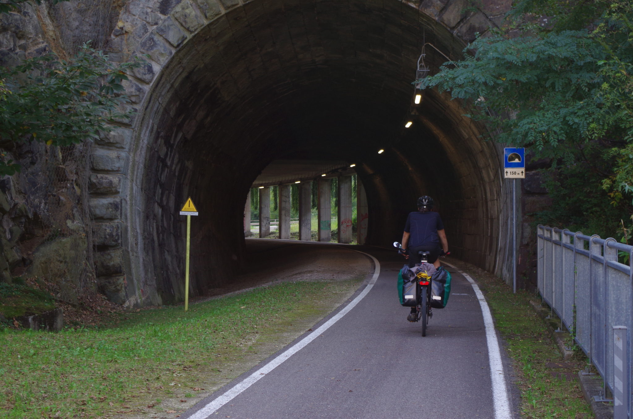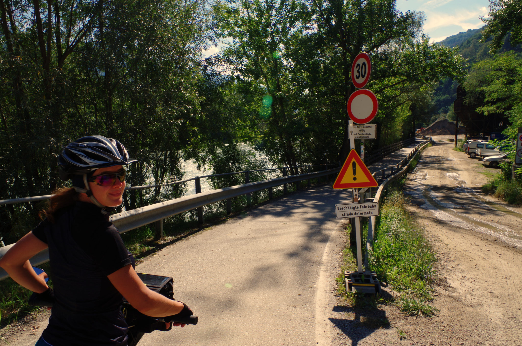 Za przełęczą, już we Włoszech, zaczyna się ścieżka rowerowa poprowadzona często równolegle do dróg, po drogach technicznych lub nieczynnych liniach kolejowych. Jedzie się bardzo przyjemnie.