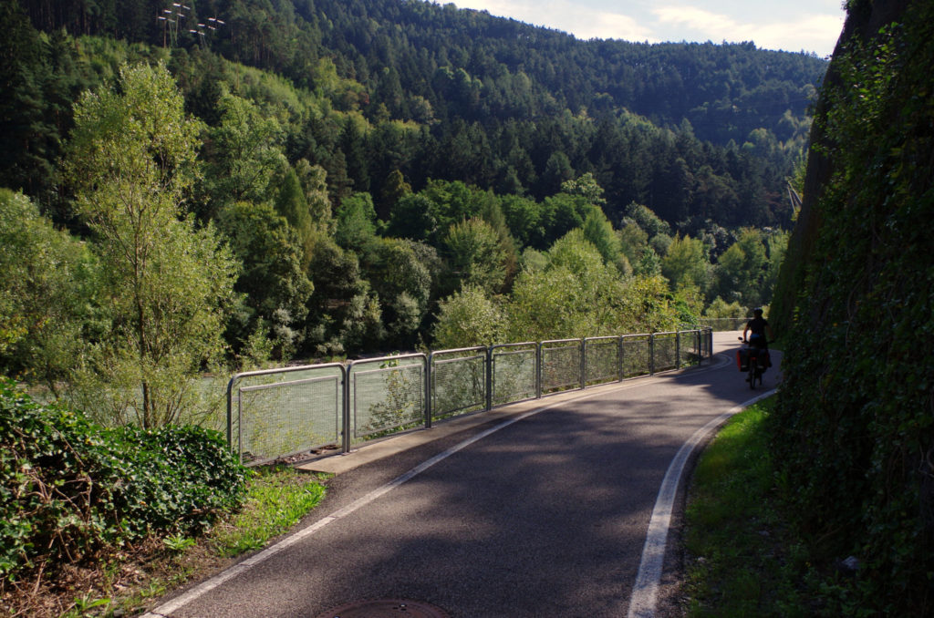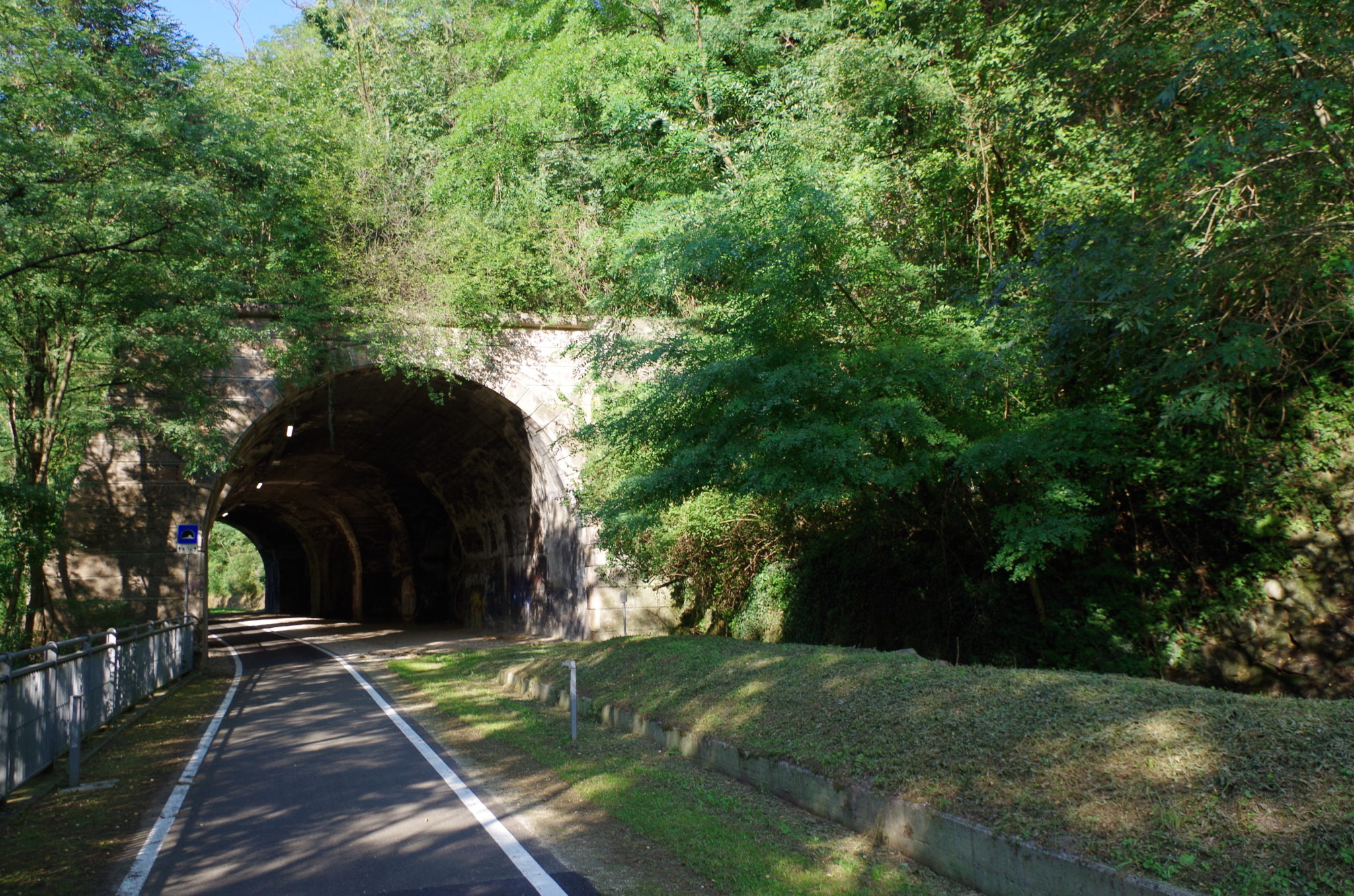 Powyższe zdjęcia – trasa biegnie po bocznych uliczkach, poprowadzona jest wzdłuż dróg, przy rzece i po nieczynnych liniach kolejowych, więc cały czas bardzo łagodnie wije się wzdłuż doliny, po drodze mijając tunele i galerie w podciętych zboczach.
