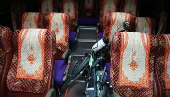Bilety kupiliśmy w kasie dworca z rana, przed uzupełnieniem zapasów, zwiedzaniem małej świątyni na wzgórzu i planowaniem dalszej trasy. Wieczorem po dość długim oczekiwaniu nadjechał autobus napakowany szczelnie ludźmi i towarami. Ledwo udało się upchać sakwy pomiędzy kartony leżące w bagażniku, rowery jechały pomiędzy siedzeniami.