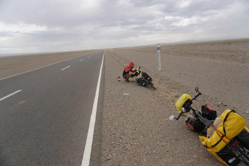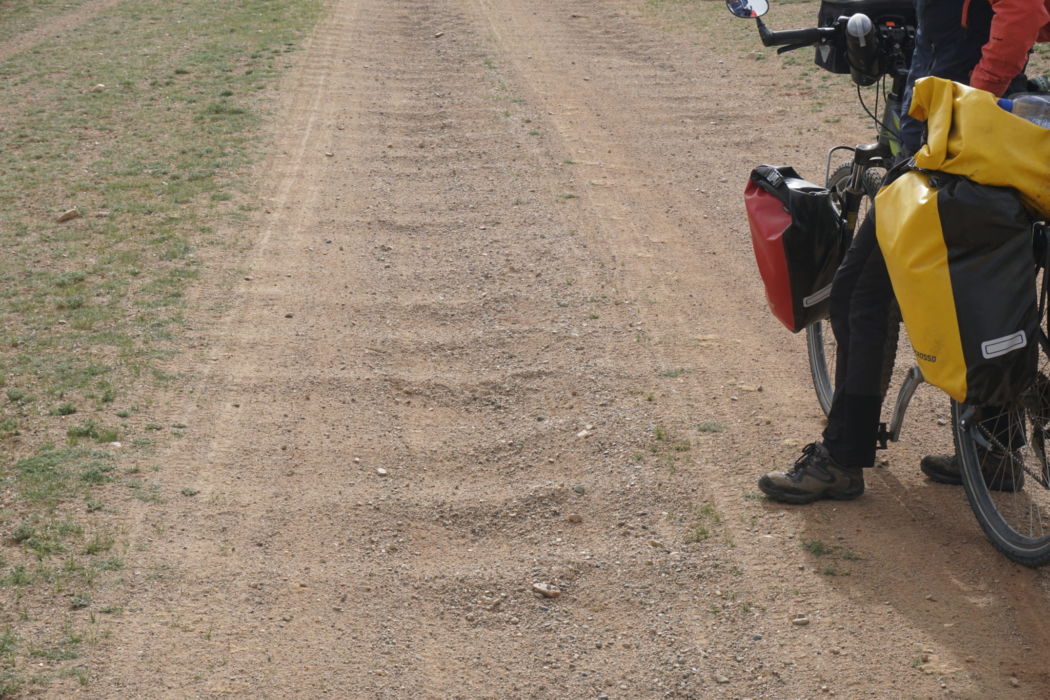 Przy huraganowym wietrze szczególnie ciężko było rozłożyć namiot. Dodatkowo w takim terenie nie da się wpić szpilek i trzeba obudowywać je kamieniami (albo jak na zdjęciu przywiązywać do rowerów).