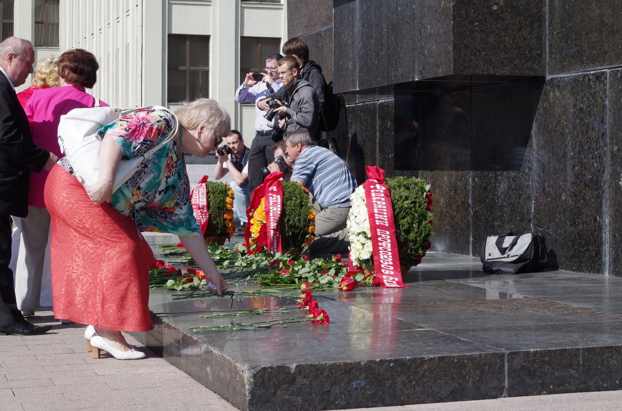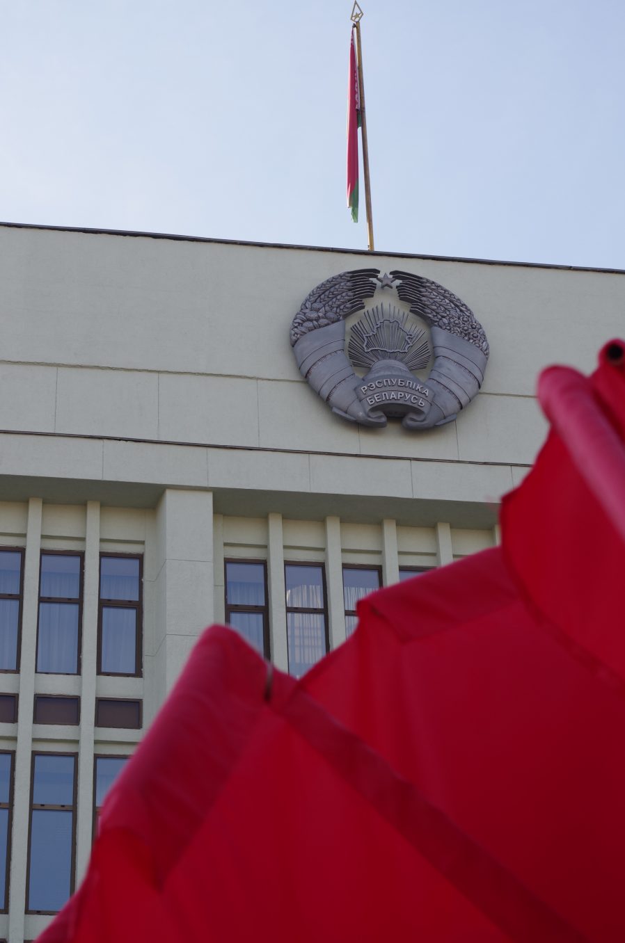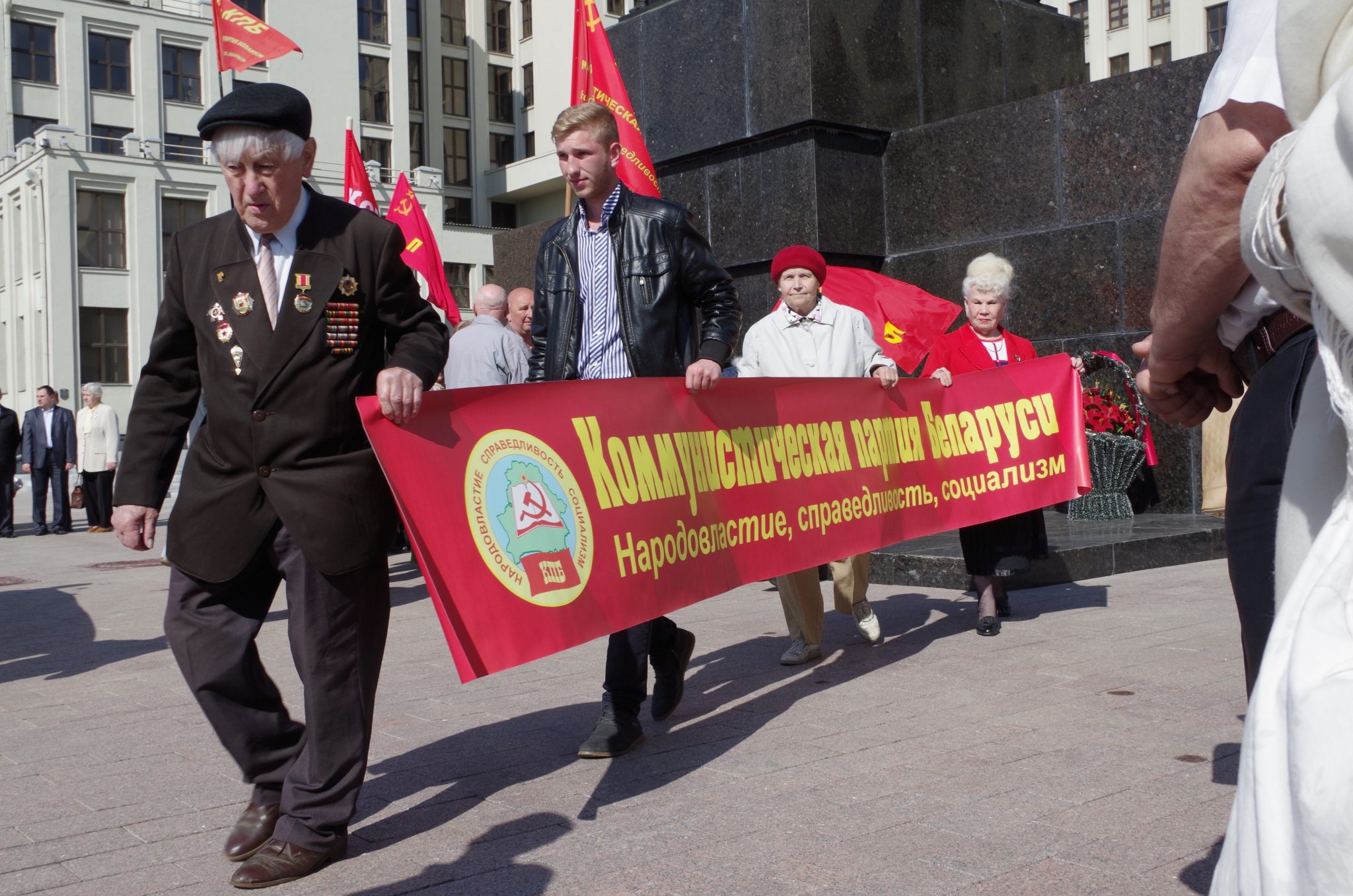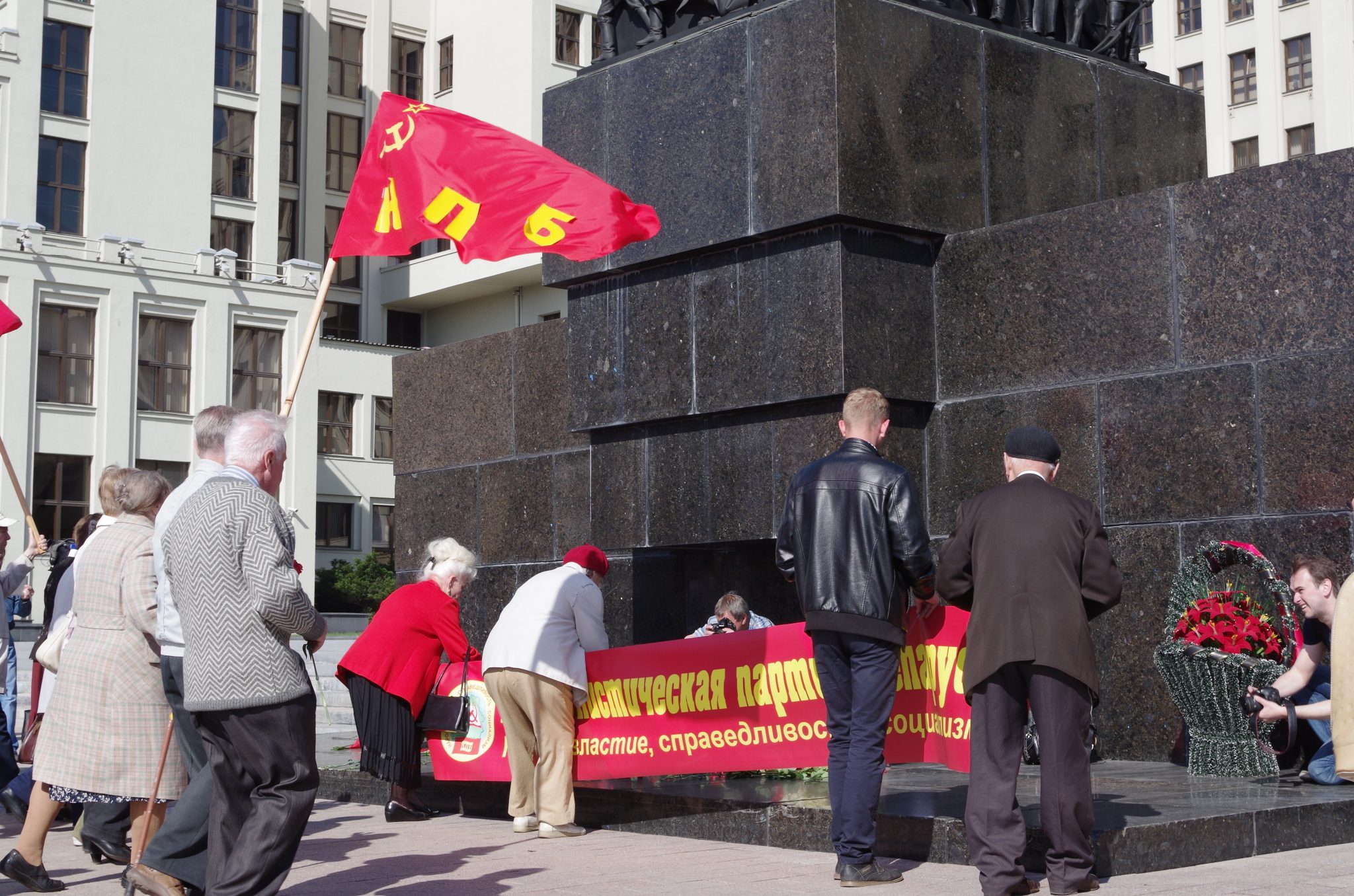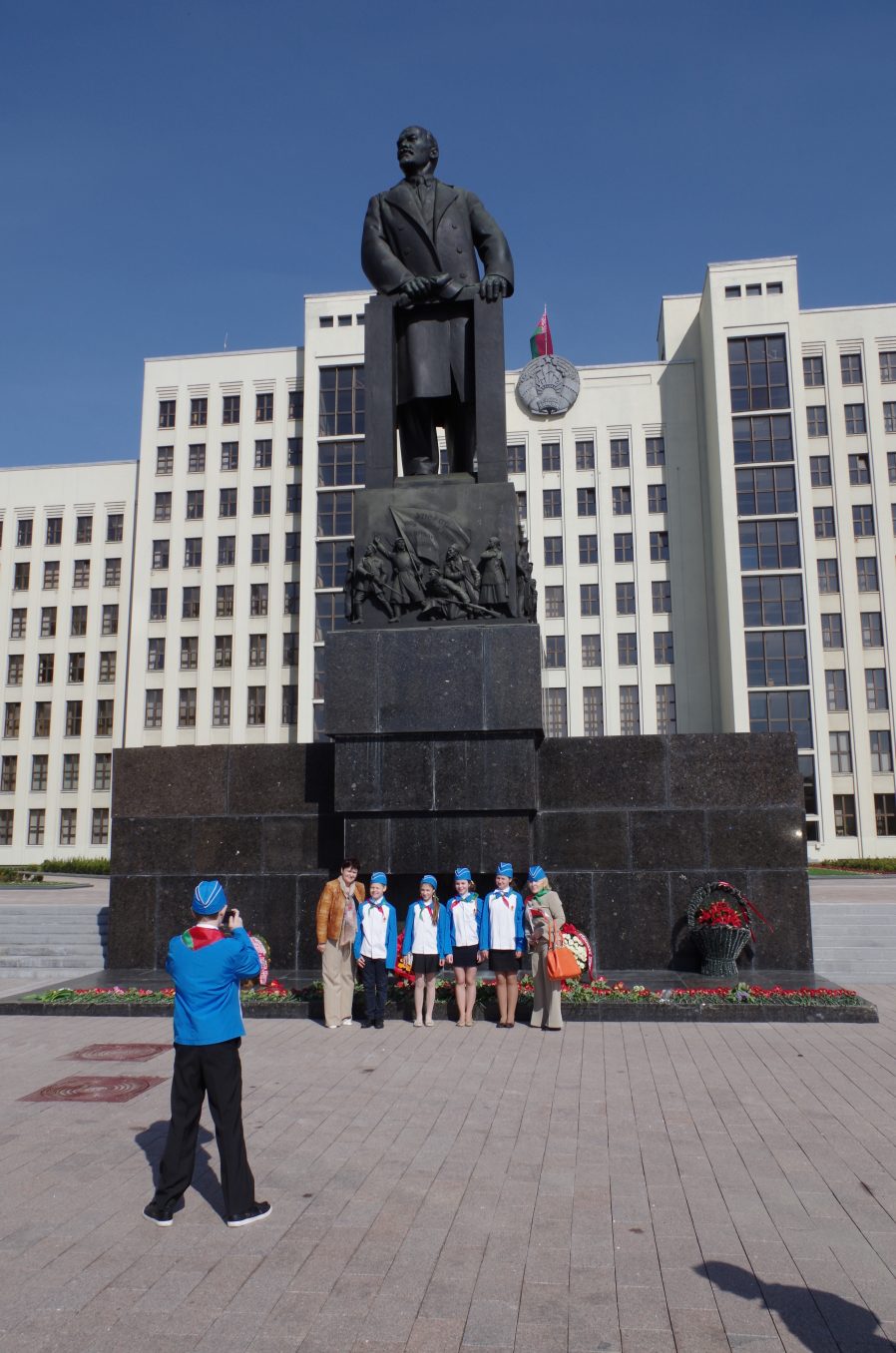 Na Plac Niepodległości powoli przybywały przywożone autokarami grupy. Nie byłotego dużo – paru pionierów, aktywiści, członkowie Komunistycznej Partii Białorusi (KPB), weterani. Większość z goździkami w rękach, porozstawiani przez organizatorów pilnujących, aby nie wchodzić w kadr filmującyh wydarzenie telewizji. Wokół spacerowicze. Krótkie przemówienie, gra orkiestra i kolejne rzędy idą złożyć kwiaty pod pomnikiem Wodza Rewolucji. Wkoło flagi i bannery KPB niesione przez starszych panów z poprzypinanymi medalami i natapirowane blond panie  w czerwonych żakietach. Tacy ludzie przynajmniej rzucają się w oczy, bo są wśród nich osoby niczym się nie wyróżniające.