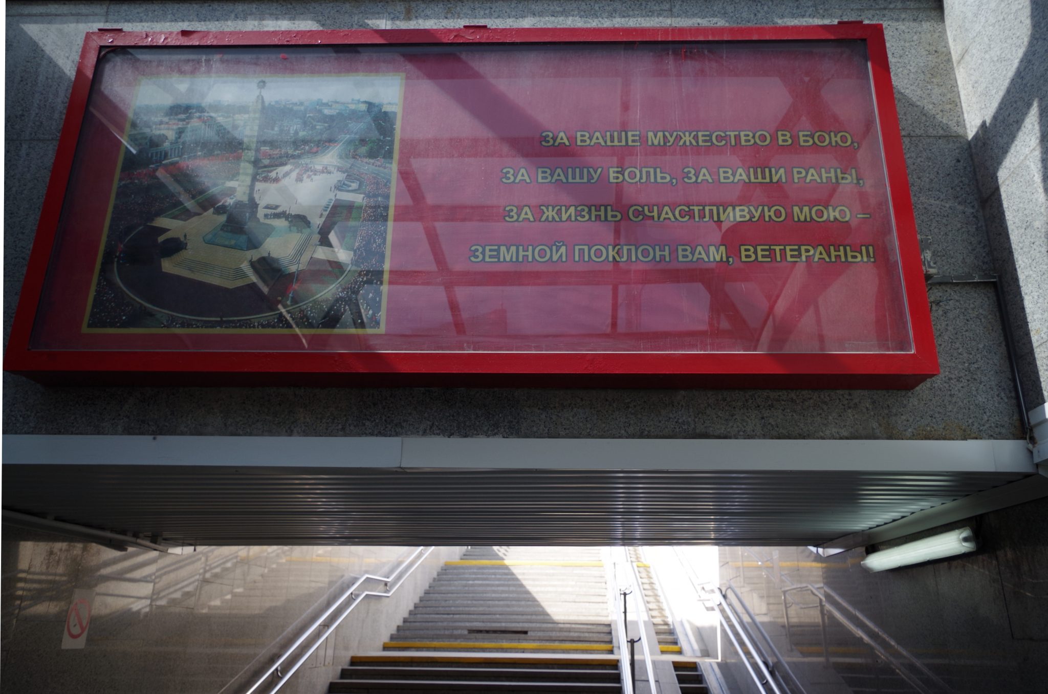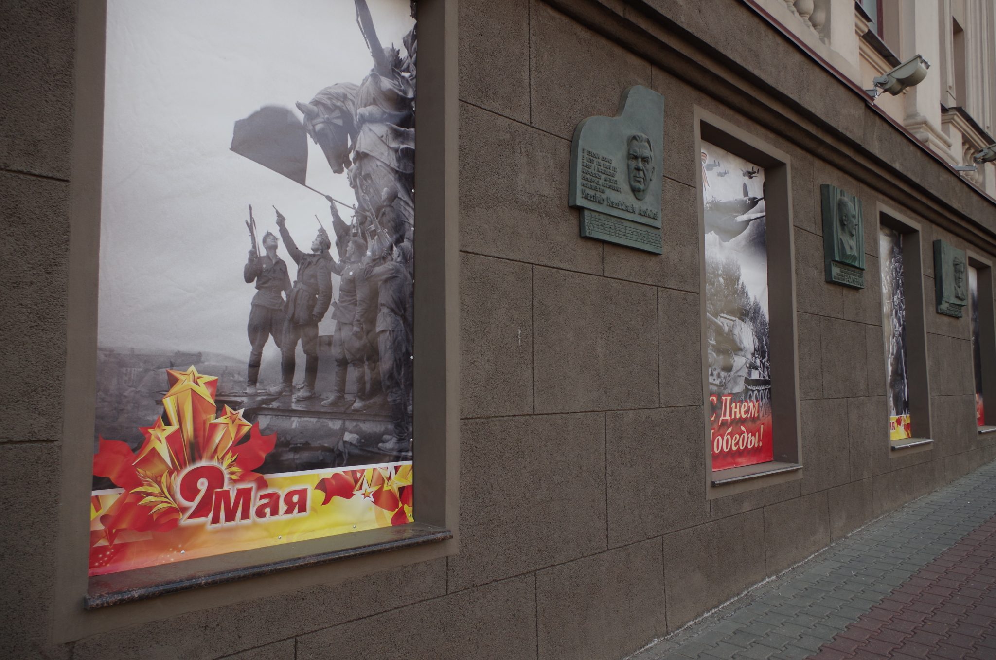 Przypomnienie o rocznicy Dnia Zwycięstwa 9. maja, Plan Niepodległości. W tle Kościół świętych Szymona i Heleny, zwany czerwonym kościołem, w którym natrafiliśmy przypadkiem na mszę świętą w języku polskim