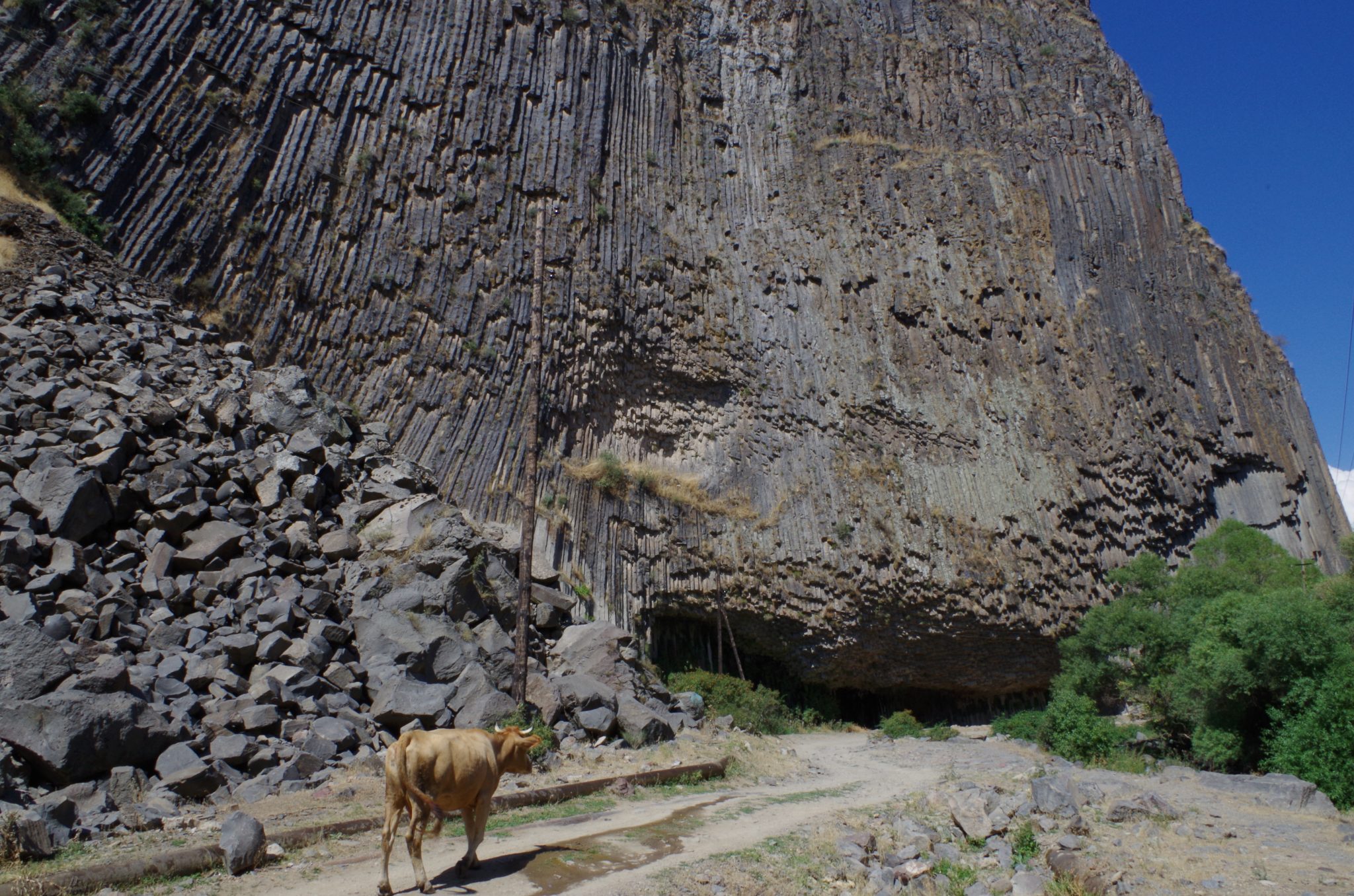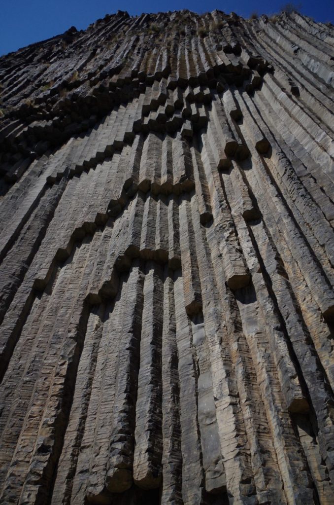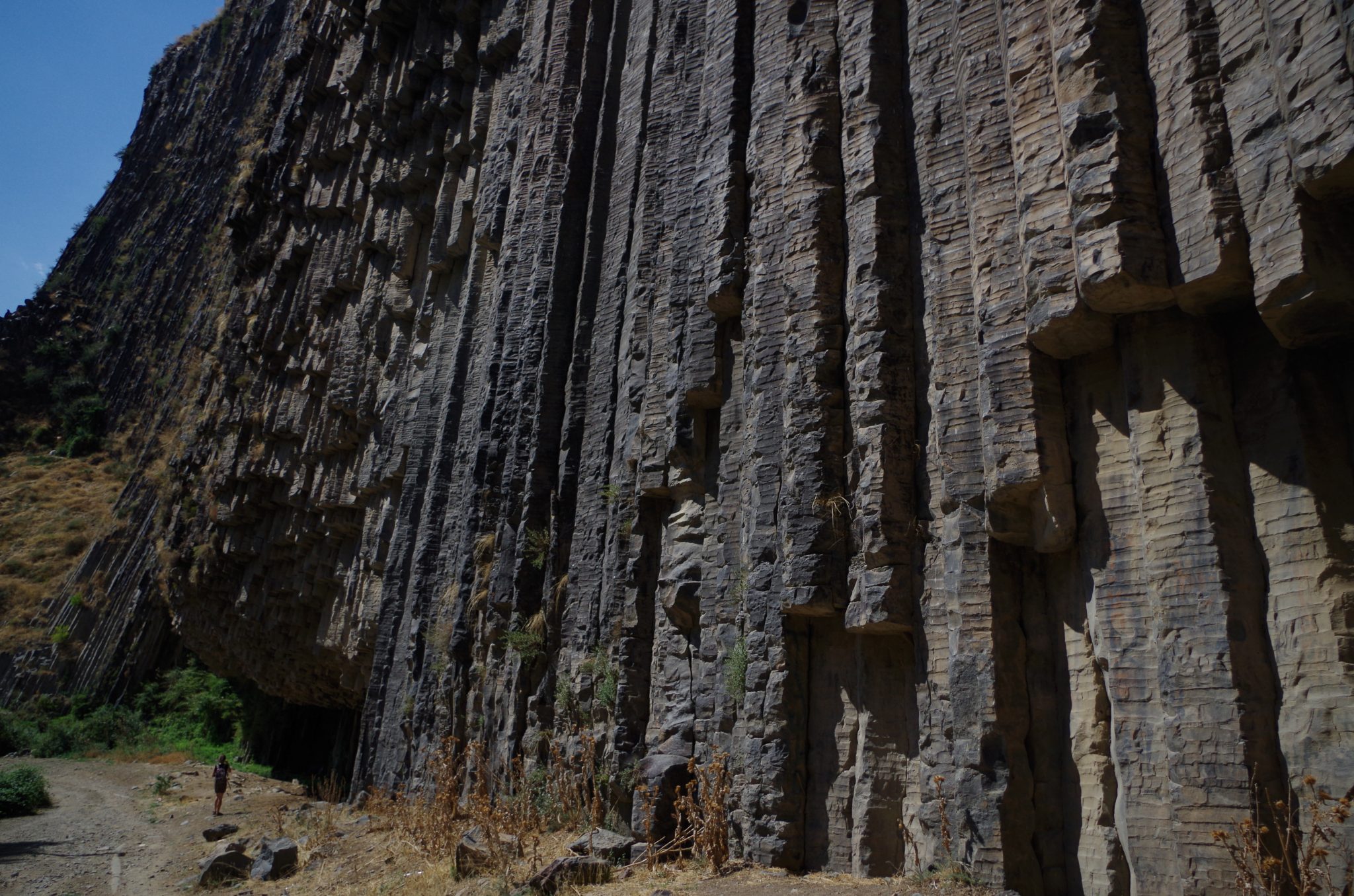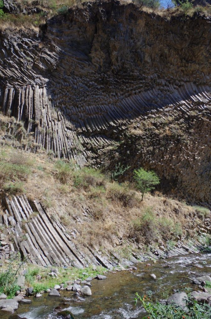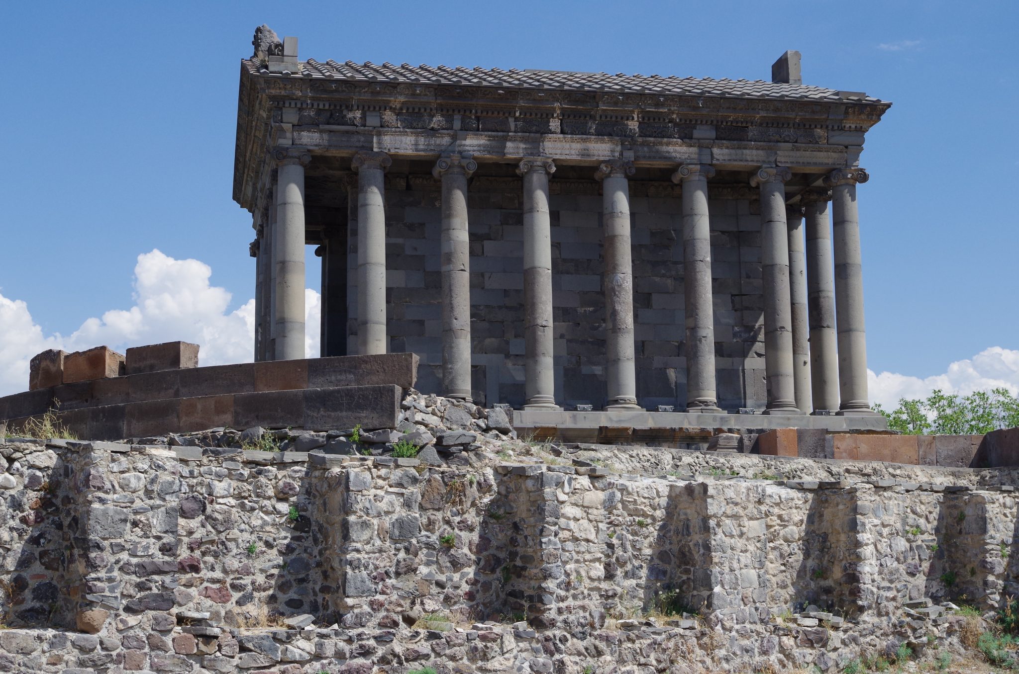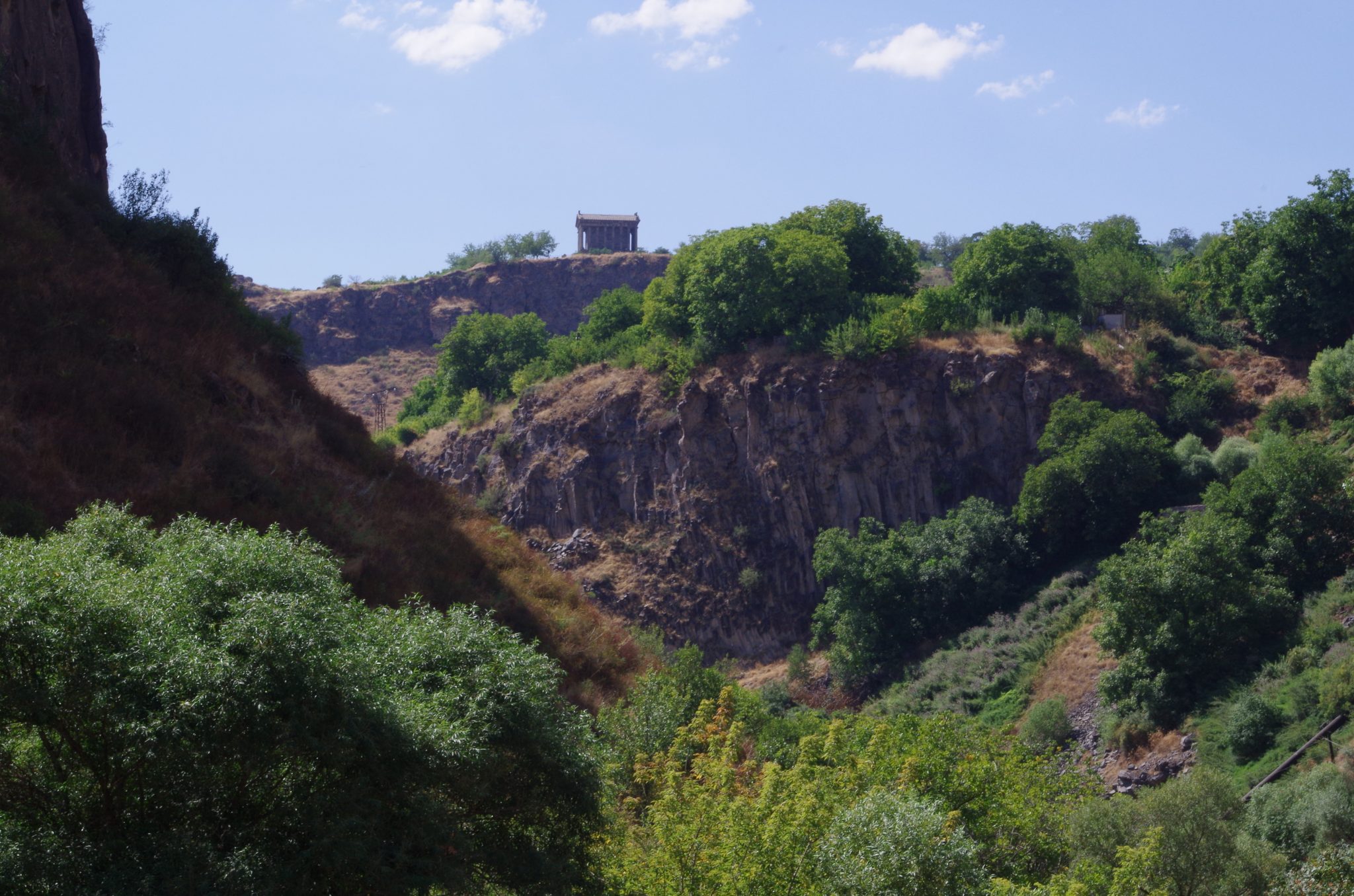 Garni to starożytna świątynia boga Słońca Mihry z ormiańskiej mitologii (posiadającej wiele wpływów zoroastryzmu). Świątynia zniszczona została w 1679 roku przez trzęsienie ziemi, które porozrzucało bazaltowe bloki po okolicy. Z ruin odbudowano ją dopiero w 1975, czyli po prawie 300 latach. Sama świątynia wygląda obecnie trochę cukierkowo, lecz przepięknie położona, na skale w zakolu rzeki, prezentuje się bardzo okazale. Schodząc do doliny, czeka jeszcze jedna, nawet większa atrakcja…