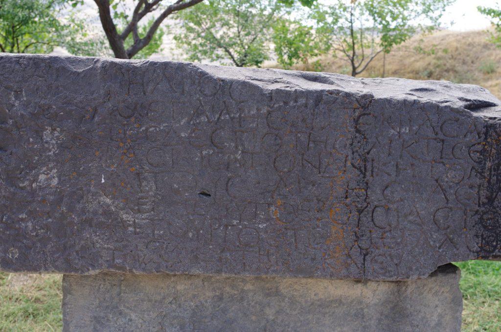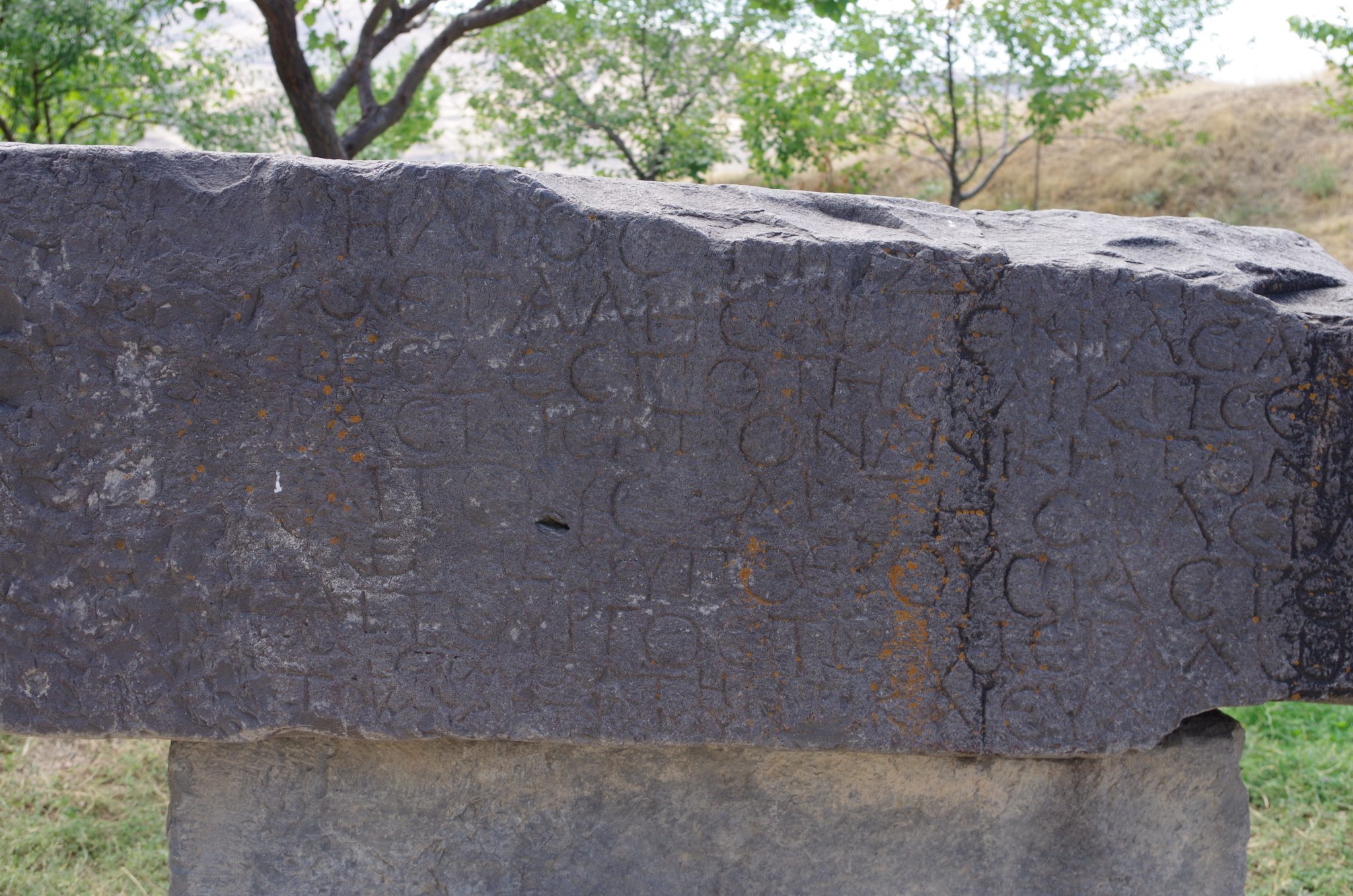 Gracka inskrypcja króla Tiridatesa I. Na podstawie jej treści określono prawdopodobną datę budowy świątyni jako 77 rok n.e.