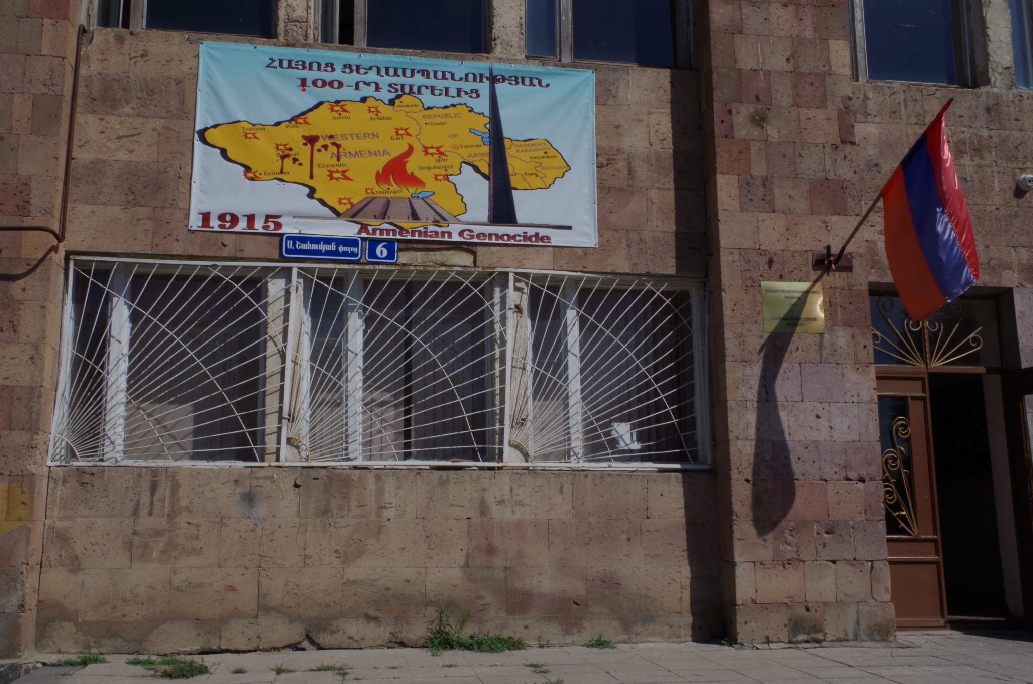 Banner na szkole upamiętniający setną rocznicę ludobójstwa dokonanego przez Turków na Ormianach.