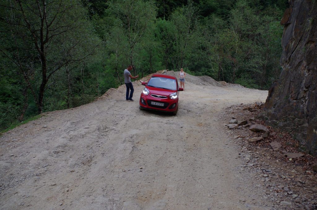Po drodze z Telawi zatrzymujemy się przy klasztorze Alawerdi (gruz.: ალავერდი), jeszcze u podnóża gór. Mury obronne wokół świątyni i jej duże jak na monastyr rozmiary zaznaczają się wśród otwartego krajobrazu. Dalej droga wcina się w głęboką, zalesioną dolinę, wspinając się po jej zboczach. Na odsłoniętym terenie przy przełęczy Abano temperatura spada kilkanaście stopni i silny wiatr przeszkadza w obserwacji nadchodzącej z doliny Alzani burzy. Przy zjeździe z przełęczy, już w Tuszetii, napotyka nas nawałnica, a w Omalo jesteśmy dopiero po zmroku. Droga, którą jechaliśmy jeszcze tydzień wcześniej była nieprzejezdna po obfitych opadach deszczu – miejscami widać było nadal zerwane fragmenty trasy.